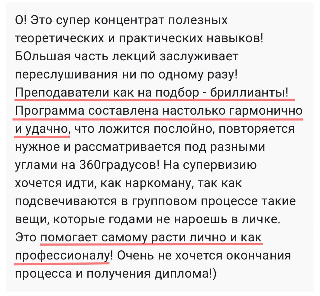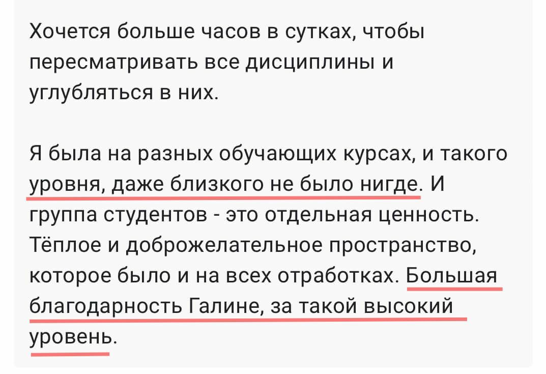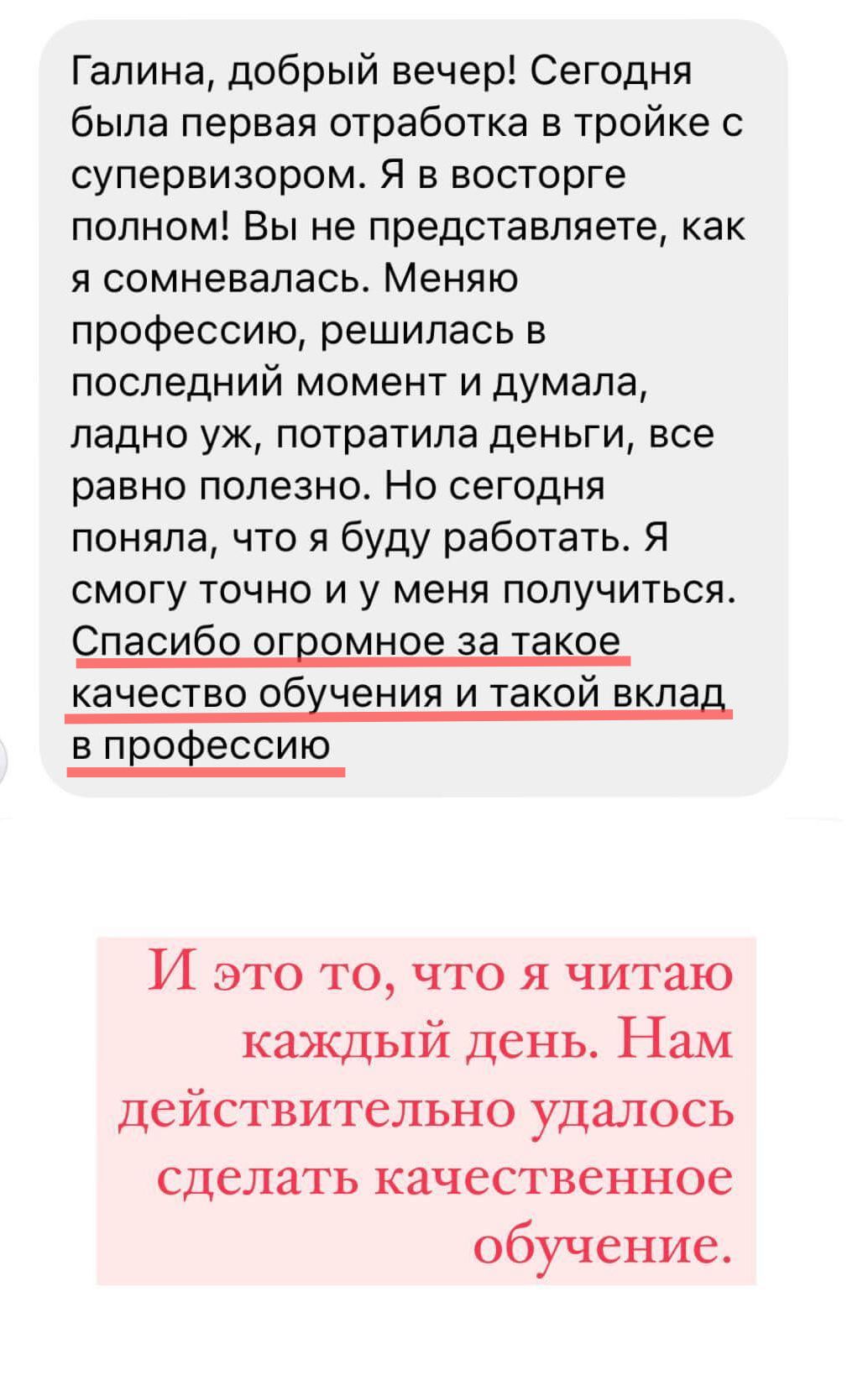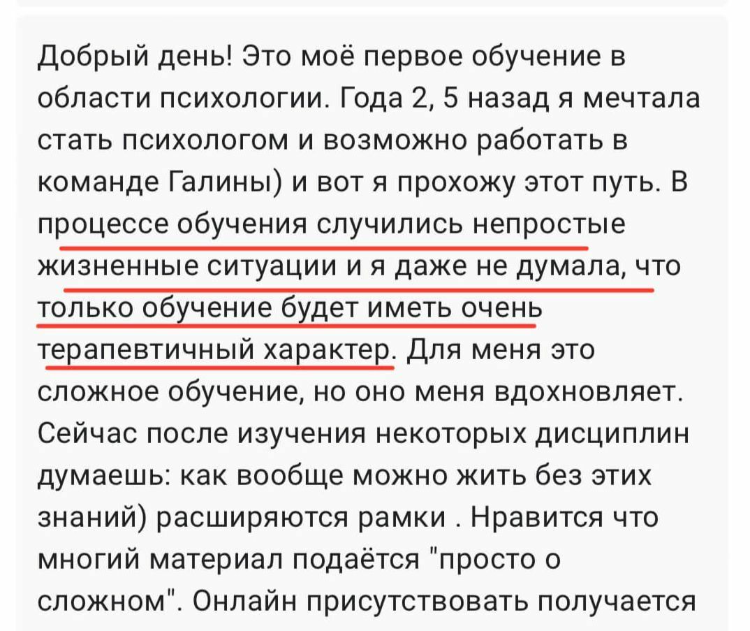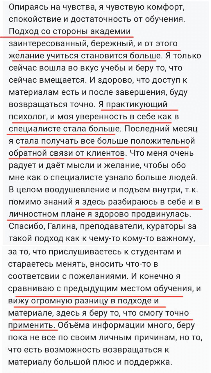 Лучших учеников после обучения размещаем на сайте и соцсетях Академии и предлагаем оплачиваемую стажировку в ПсиЦентре Галины.